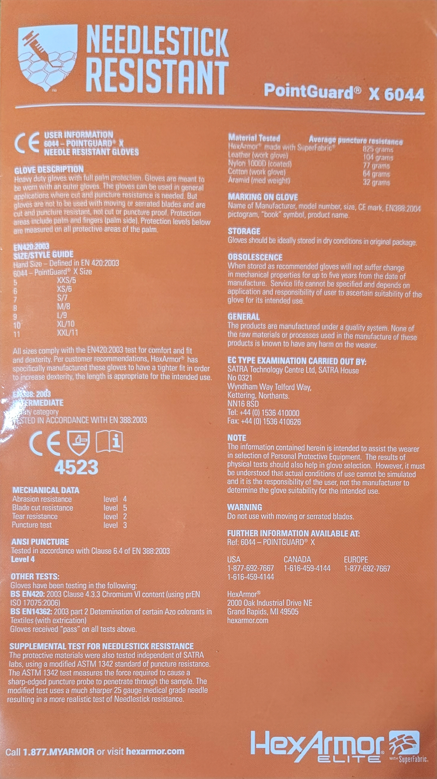 HexArmor Schnitt und Nadelstich Schutzhandschuhe PointGuard X 6044